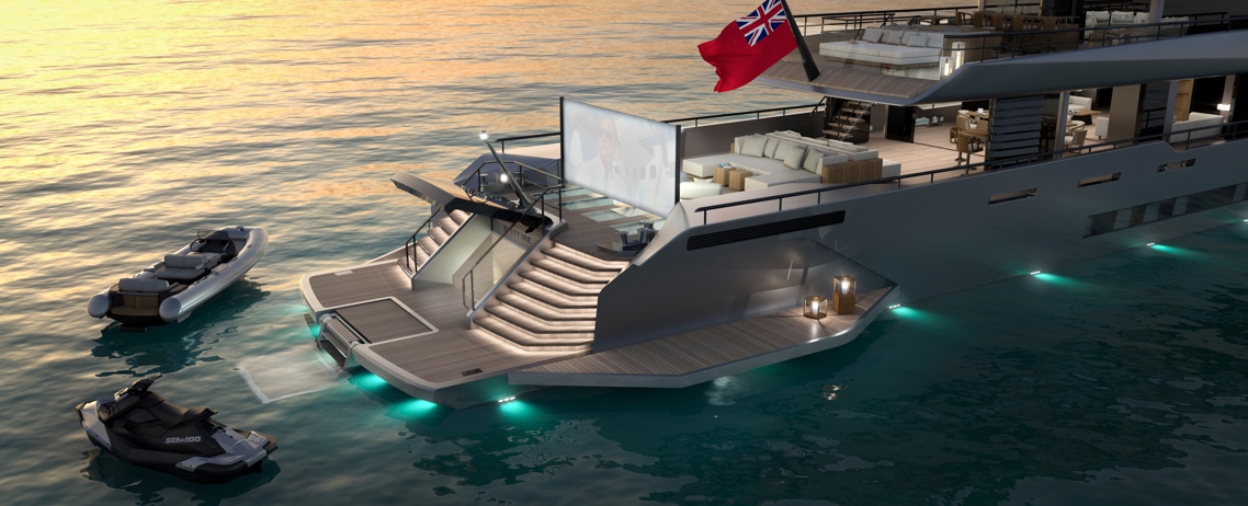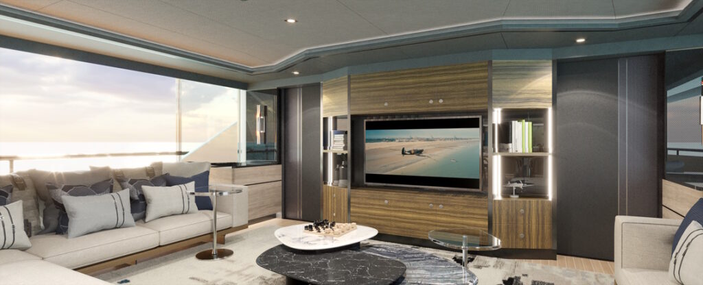 Una característica destacada de la cabina del propietario se puede encontrar en su cama independiente que ofrece líneas de visión épicas de 270 grados. Los cinéfilos también pueden aprovechar la sala de cine al aire libre que se encuentra en la cabina delantera privada de la cabina del propietario, con sus pantallas laterales retráctiles y secciones de baluarte de vidrio que brindan un telón de fondo oceánico realmente impresionante.