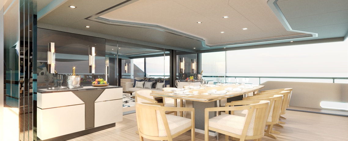 Una característica destacada de la cabina del propietario se puede encontrar en su cama independiente que ofrece líneas de visión épicas de 270 grados. Los cinéfilos también pueden aprovechar la sala de cine al aire libre que se encuentra en la cabina delantera privada de la cabina del propietario, con sus pantallas laterales retráctiles y secciones de baluarte de vidrio que brindan un telón de fondo oceánico realmente impresionante.