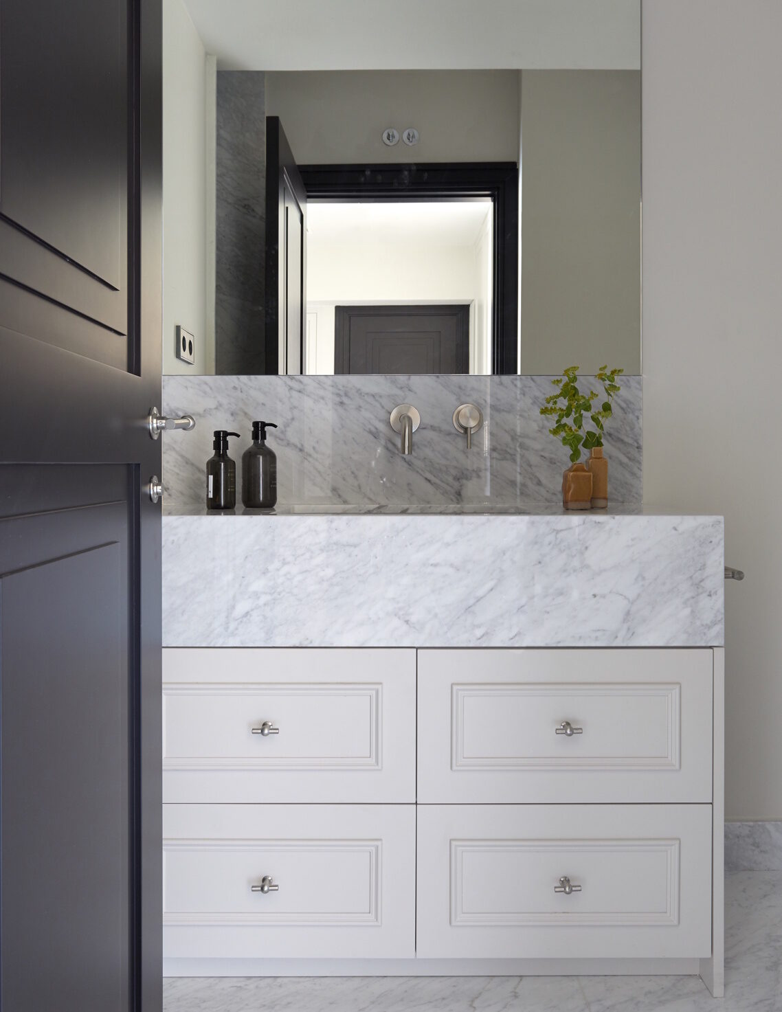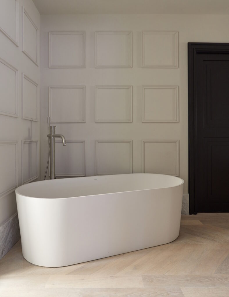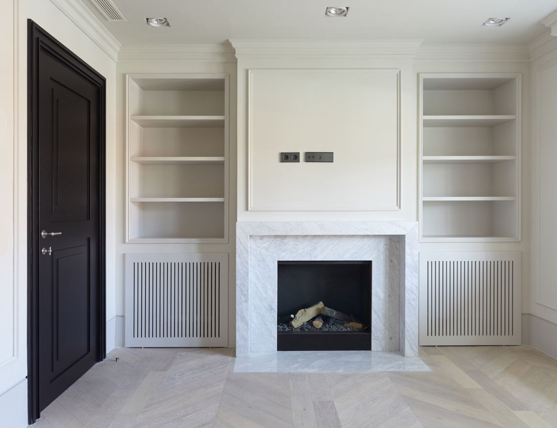 El reto de esta transformación fue convertir un espacio compartimentado en múltiples estancias en una vivienda fluida y luminosa, sin perder el encanto original del edificio de 1900. Para ello, se ha apostado por materiales nobles como mármoles naturales, madera maciza y carpintería a medida, que aportan calidez y exclusividad en cada rincón.