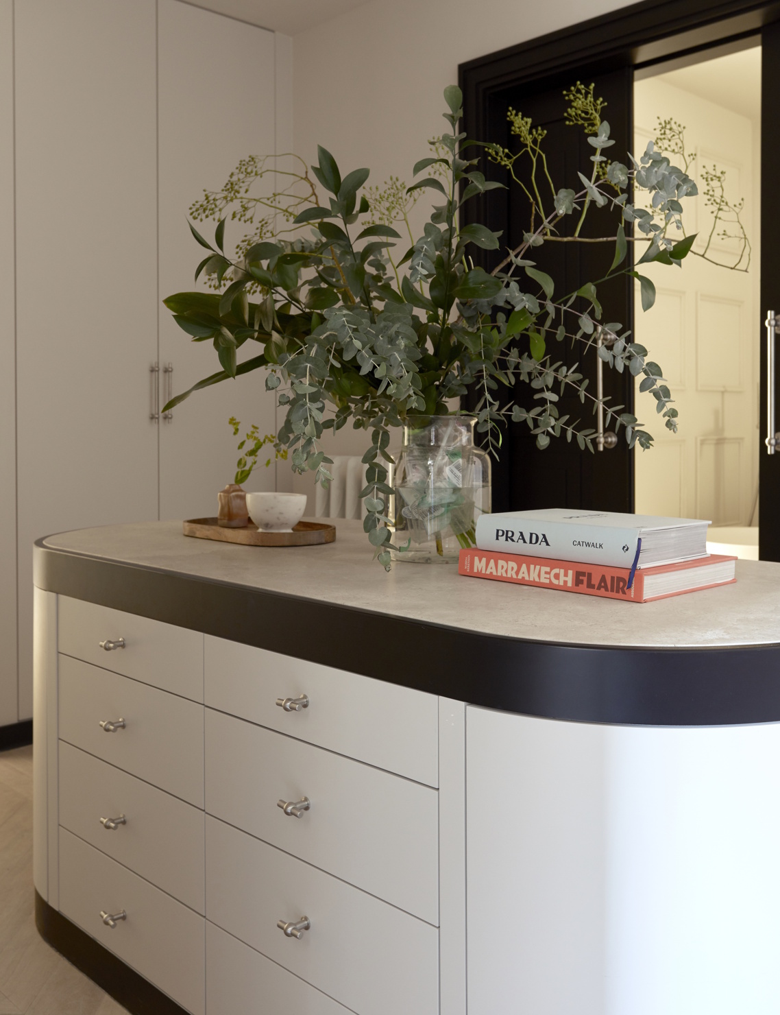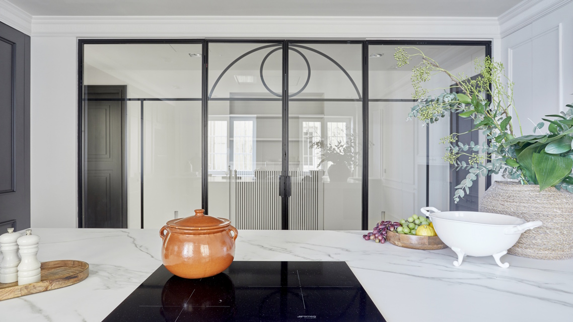 La cocina, separada por un elegante cerramiento de hierro y cristal, se concibe como el corazón del hogar. Equipada con electrodomésticos de alta gama y una isla central de mármol esculpido, se convierte en un espacio sofisticado y funcional, pensado para disfrutar tanto en el día a día como en reuniones sociales.